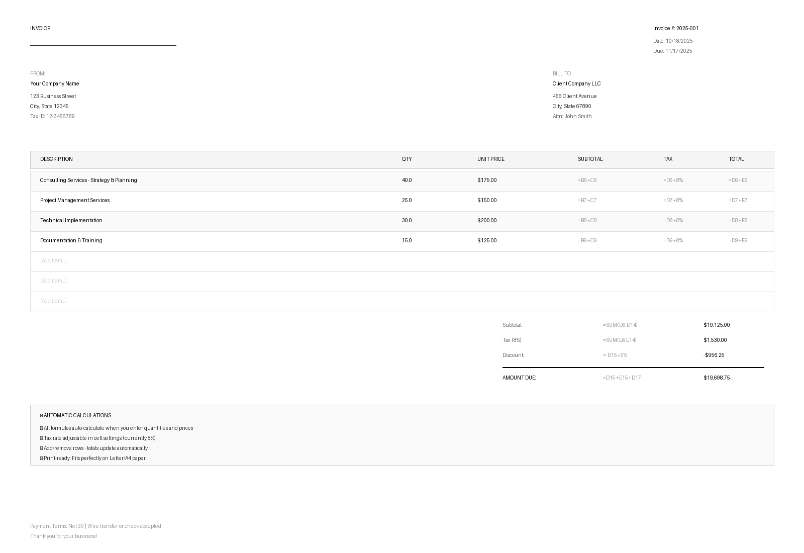 - Automatic Calculations - Built-in formulas calculate subtotals, tax, and totals instantly